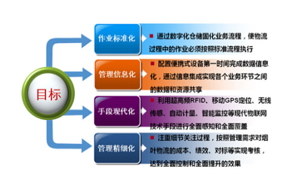 實現中心倉庫煙葉的入庫、出庫、移庫、倉儲、盤點、物流的數字化和可視化管理。包括基于 RFID煙包標簽的定位和溯源、倉儲各環節精細化管理、煙葉庫溫度濕度監控、可視化倉儲展示、數字化管理等。所涉技術包括移動互聯、超高頻RFID、GPS定位、虛擬仿真、無線溫濕度傳感、智能視頻分析與監控、自動計量傳送帶等,運用標準質量控制PDCA循環對供應鏈上游進行引導和控制,采集下游反饋信息改進物流工作水平,達到煙葉物流工作的全面控制和全面提升。